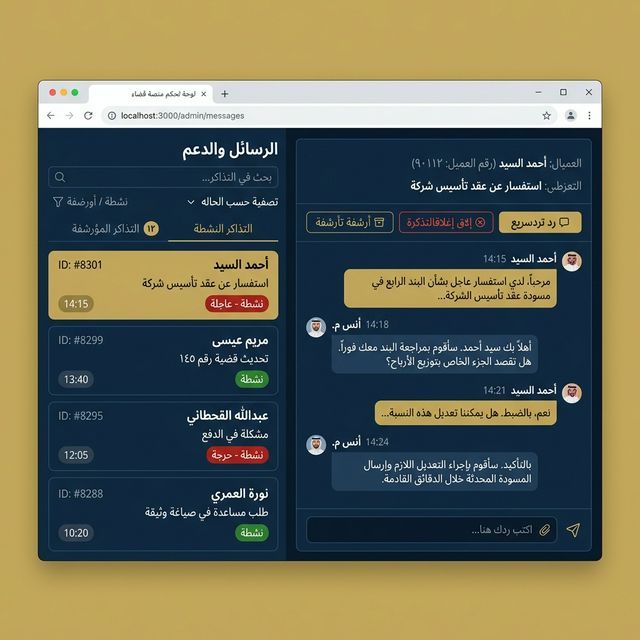 نظام تذاكر احترافي مع محادثات حية، أرشفة، بحث فوري، ومرفقات قانونية.
