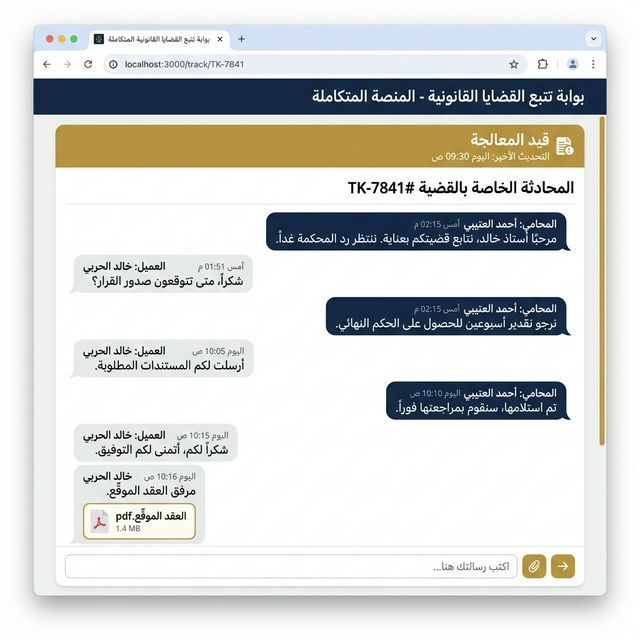 بعد إرسال طلبه، يستلم كل موكل كود متابعة فريد. يتسجل في البوابة ويتابع حالة القضية والردود لحظة بلحظة، بدون مكالمات لا داعي لها.