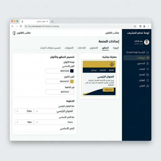 11 تبويب للتحكم في كل شيء: الألوان، الهوية، الخدمات، الحجز، SEO والمحتوى.
